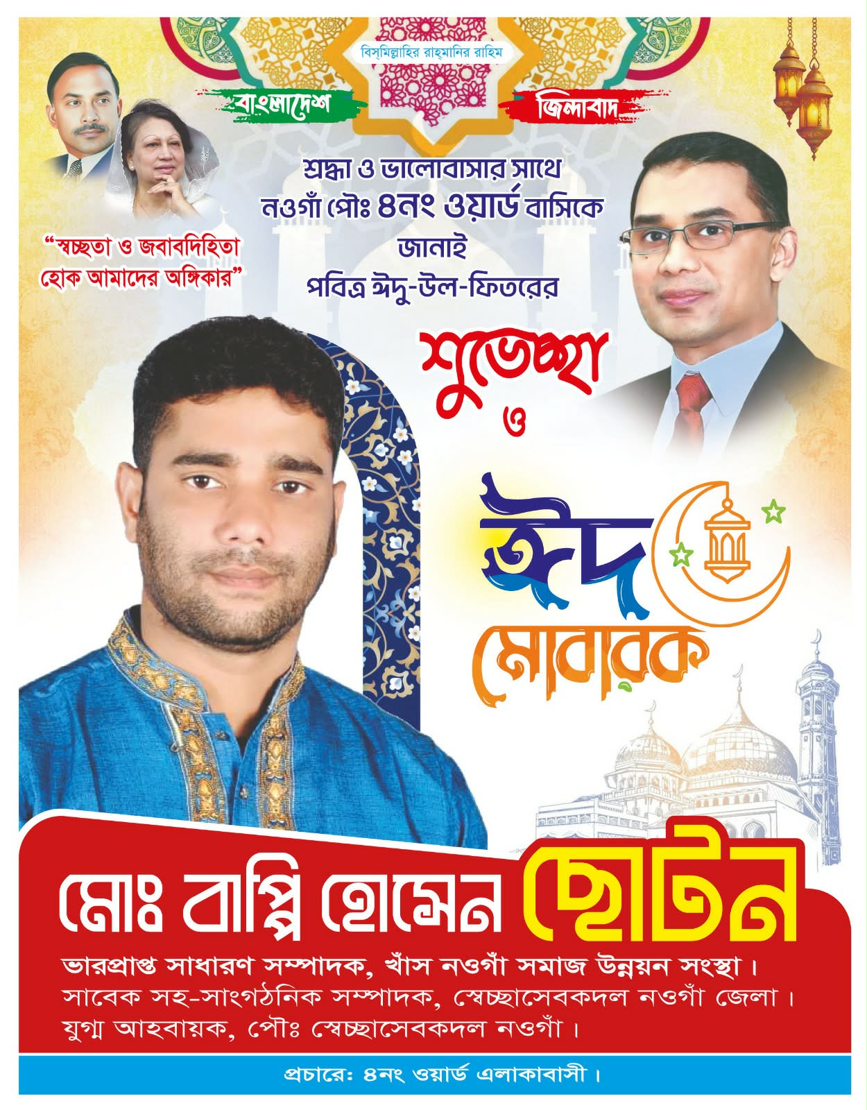 এদিকে পবিত্র ঈদুল ফিতর উপলক্ষে বাপ্পি হোসেন ছোটন ৪ নং ওয়ার্ডসহ নওগাঁ পৌরবাসীকে আন্তরিক শুভেচ্ছা ও মোবারকবাদ জানিয়েছেন।