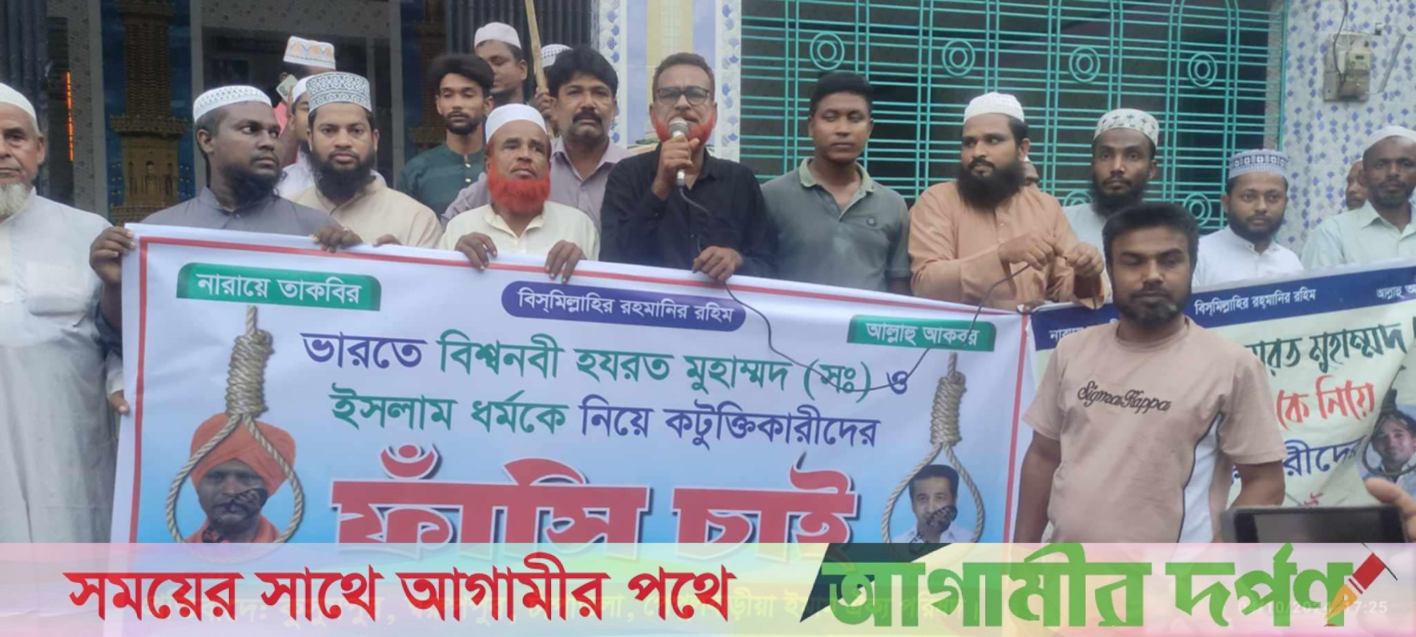 মহানবী হজরত মুহাম্মদ (সা.) -কে নিয়ে ভারতীয় পুরোহিতের কটূক্তি এবং সেই বক্তব্যকে বিজেপির এক নেতার সমর্থন দেওয়ার প্রতিবাদে মহেশপুরের বিভিন্ন এলাকায় বিক্ষোভ মিছিল ও সমাবেশ অনুষ্ঠিত হয়েছে। আজ শুক্রবার জুমার নামাজের পর, স্বরুপপুর ইউনিয়নের পেপুল- বাড়ীয়া, কুসুমপুর, স্বরুপপুর, চাঁপাতলা ইমাম এক্য পরিষদ সহ এলাকায় স্থানীয় সংগঠনের উদ্যোগে এসব কর্মসূচি আয়োজন করা হয়। সমাবেশে স্বরূপপুর ইউনিয়ন বিএনপির সভাপতি জুলফিকার আলি বিশ্বাস বলেন, আগষ্ট মাসে রাসুল (সা:)- কে নিয়ে কটূক্তি করেন ভারতের মহারাষ্ট্রের হিন্দু পুরোহিত রামগিরি মহারাজ।তাঁকে সমর্থন করেছেন বিজেপির বিধায়ক নীতেশ রানে।এ দুজনের বিরুদ্ধে থানায় মামলা হলেও এখনো রাজ্য সরকার তাদের গ্রেপ্তার করেনি। পেপুল-বাড়ীয়া গ্রামের জামে মসজিদের ইমাম হাফেজ ইউনুছ আলী, বলেন,আমরা এর তীব্র নিন্দা ও প্রতিবাদ জানাই। মহানবীকে অবমানকারীদের গ্রেপ্তার করে সঠিক বিচারের দাবি জানাই।'উক্ত সমাবেশ আরো বক্তব্য দেন, কেশবপুর বায়তুলনুর জামে মসজিদের খতিব হাফেজ মাঃ মেহেদী হাসান, স্বরুপপুর ইউনিয়ন বিএনপির সাংগঠনিক সম্পাদক মিজানুর রহমান, মূফতি : জালাল উদ্দিন, উপজেলা সেচ্ছাসেবকদলের সদস্য সচিব, সুরুজ্জামান (সুরুজ) হাফেজ হাফিজুর রহমান, হাফেজ, নাজমুস সাকিব, মুফতি আলামিন, মাঃ ফিরোজ, ইউনিয়ন যুবদলের আহবায়ক, নান্নু মিয়া, যুগ্ম আহবায়ক সাংবাদিক সাবিবর, যুগ্ম আহবায়ক চয়ন হোসেন, স্বরূপপুর ওয়ার্ড বিএনপির সভাপতি শফি উদ্দিন, ইউনিয়ন কৃষকদল নেতা সানোয়ার হোসেন, ইউপির ছাত্রলের সাধারণ সম্পাদক কামরুল ইসলাম, সহ স্থানীয় নেতৃবৃন্দ।।